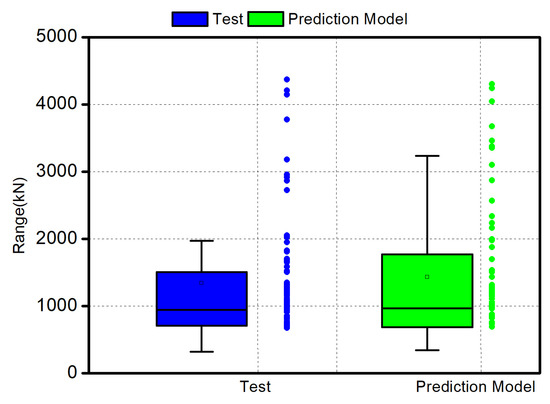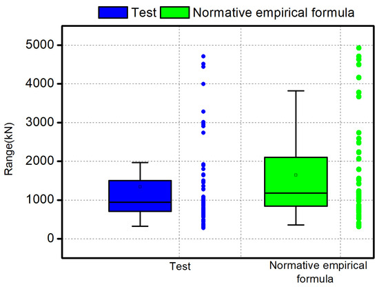 The traditional empirical model uses 122 sets of test data collected in this paper as samples, calculates parameters after determining their respective probability distribution, and then generates data. To reflect the distribution characteristics of the test data and the data generated by the traditional empirical model, the two groups of data distribution characteristics are compared. In this paper, a box diagram of the bearing capacity of the test data and the traditional empirical model is drawn. The Y-axis shows the values obtained from the data, as shown in Figure 5. Figure 5 shows that the median, maximum, and data dispersion calculated by the traditional empirical model are close to those of the test data.