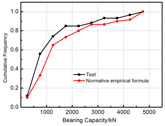 Cumulative distribution function curve of the bearing capacity calculated by the Chinese empirical formula compared with the test data.