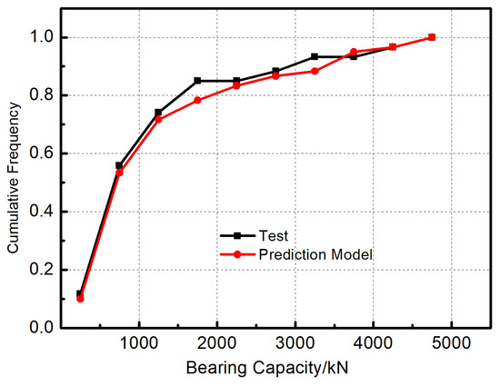 To compare the overall distribution of the two groups of data, the cumulative distribution function curve of the bearing capacity of the test data and the data generated by the traditional empirical model is drawn in Figure 6. The parameter value is displayed on the horizontal axis and the cumulative probability is displayed on the vertical axis. As shown in Figure 6, the 122 cumulative distribution function curves of the data generated by the traditional empirical model are not consistent with the 122 original data curves.