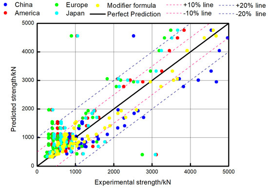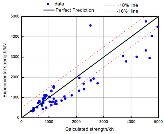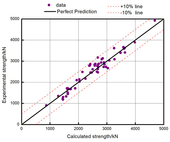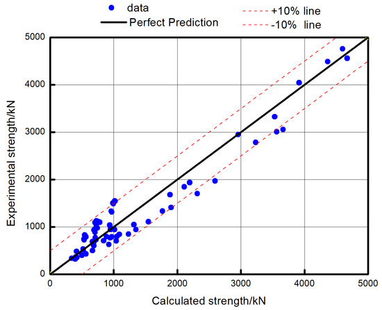 In order to verify that the proposed bearing capacity model can predict data outside the database, this article collected an additional 60 sets of data [71,72,73,74] as test sets to verify the accuracy of the formula. From the results in Figure 12, it can be seen that the data points calculated by the proposed calculation formula are concentrated within an error line of ±10%, with an accuracy of 93.73%. Therefore, the proposed formula can be used to calculate the bearing capacity of concrete filled steel tubular columns with different cross sections.