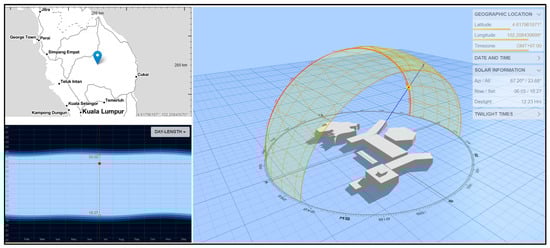 The case study is in Kuala Lumpur, Malaysia, 3.1569° N, 101.7123° E. The campus library, which is located at a university, houses a collection of published and unpublished materials, with a particular emphasis on the Malay language, literature, and culture. To ensure preservation, the materials are stored in closed stacks, but designated reading areas are available for users to access reference facilities. Monographs, conference papers, official publications, manuscripts, and personal collections are all materials housed in the library. Moreover, the library consists of reading zones, including free zones, and individual and group study areas. Figure 1 shows the location of the building on the university campus and a bird’s-eye view of the surrounding buildings. The building has a north–south axis, and many surfaces of the façade are in the east and west elevations. Thus, the building receives a high amount of solar radiation and heat on the east and west surfaces.