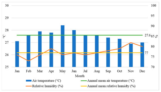 Kuala Lumpur has a tropical rainforest climate according to the Köppen climate classification [], which is characterized by a high humidity and abundant rainfall throughout the year. Ten years of microclimate data were collected from the nearest meteorological station, Petaling Jaya meteorological department. As shown in Figure 3, the temperature tends to remain around 27–28 °C. The data show that the monthly average temperature is at its highest in May and June. Additionally, the high relative humidity, ranging between 74.4% and 81.3%, can also contribute to indoor air quality issues, such as mold growth, which may affect the health and comfort of library patrons and staff. The hot and humid climate throughout the year highlights the importance of proper ventilation and cooling systems in the library. Thus, it is crucial to consider these factors when designing or retrofitting the library building to ensure a comfortable and healthy indoor environment.