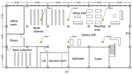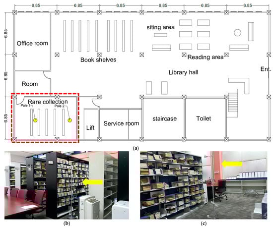 (a) Library layout and data loggers installed on (b) pole 1 and (c) pole 2.