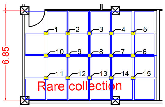 The HOBO data loggers and air velocity sensors were set in the library hall and rare collections room to collect data on the indoor temperature, relative humidity, and air velocity. Figure 4a shows the locations of the poles in the layout plan within the special collections room. The room is specified with a dashed red rectangle. Moreover, the positions of the poles in the room are highlighted by yellow points. A total of six HOBO data loggers were distributed in the room for special collections to record the indoor air temperature and relative humidity at various levels. The air velocity sensors were installed 1.1 m above the ground. Each of the three data loggers was installed on a clamp, which was screwed on a pole, at heights of 0.2, 1.1, and 1.8 m above the ground. The condition of rare collections room was different from that of the library hall. The intensity of light and noise variation depends on the distance from the window. To monitor the effect of the intensity of the lights on the rare collection, several points were condensed. However, the distribution of conditioned air by the mechanical device was equal at all points of the room. It should be mentioned that the supply air temperature was constant during library operation. To prevent the collection of useless data for thermodynamic conditions, only two points were selected (Figure 4). The data loggers were installed horizontally, at least 0.8 m from the internal walls, to minimize the impact of the radiative temperature. To measure the light intensity and noise level in rare collections room (10 m × 6.9 m), 15 recording points were selected, as shown in Figure 5, arranged in a rectangular matrix with 1.2 m spacing for precise results.