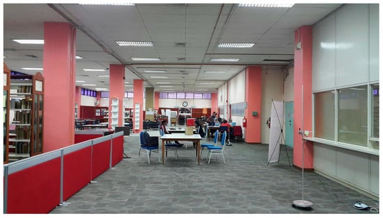 In addition to rare collection room, this study conducted field measurements in the library hall to determine the environmental conditions, such as air temperature, relative humidity, air velocity, light intensity, and noise level. As shown in Figure 6, the library hall consists of different spaces, such as a reading area, bookshelves, a sitting area, and an entrance area; thus, multiple data loggers were placed to obtain accurate recordings. Six locations were selected for field measurements, as highlighted in Figure 7a.