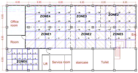 In addition to measuring the previously mentioned parameters, this study also measured the light intensity and noise levels in the library hall. To ensure accurate data collection, the layout of the library hall was divided into 40 rectangles, and the center points of these rectangles were chosen for measurement. Figure 8 illustrates the matrix used to record these parameters, as well as the zoning of the spaces. The distance between the measured points was approximately 3.5 m, the length of the room was 41.5 m, and the width was 20.5 m. The matrix design allowed for an evident analysis of the light intensity in each space. The layout of the building was also divided into six zones to analyze and discuss the noise level in each zone. Table 3 provides a clear description of the zones in the library hall and rare collection room. Through the zoning analysis, the minimum, maximum, and average values of the noise level were determined. The number of points for measurement varied based on the area of each zone. As most of the space was designated for reading, 14 points were selected for measurement. In zone 6, rare collection room, 15 points were selected for light intensity and noise level measurements.