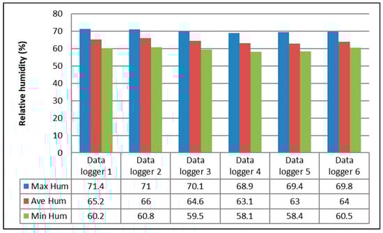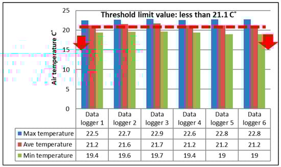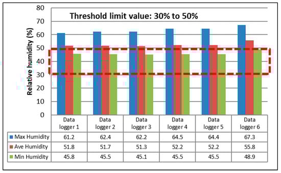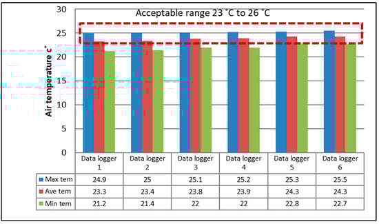 The indoor air temperature in rare collection room demonstrated a clear trend over the course of the measurement period, with fluctuations indicating changes in the ambient temperature and the HVAC system’s performance, as shown in Figure 9. This graph depicts the data collected by the six HOBO data loggers placed at different heights on poles 1 and 2. As the room was air-conditioned, the average air temperature in the room was found to be 21.2 °C to 21.7 °C and was constant across all locations. Based on the study by Ogden [], the acceptable mean indoor air temperature in a room with valuable collections should be less than 21.1 °C. The standards suggest around 18 °C (see Table 2) [,]. Thus, the mean air temperature in rare collection room was slightly higher than that in the recommended guidelines and standards for objects. However, this finding can be compared with the findings in the literature on indoor air temperatures in buildings. According to [], the recommended indoor air temperature range for thermal comfort in buildings is between 20 and 25 °C, with a target of around 22 °C. The average indoor air temperature of the library, as reported in this study, fell within this recommended range. It should be mentioned that the maximum air temperature variation was 3.8 °C, which was observed in data loggers 5 and 6. This variation is because the outdoor temperature variation influences the indoor air temperature, and although the supply air temperature was constant, this resulted in a min air temperature of 19 °C and a max temperature of 22.8 °C.