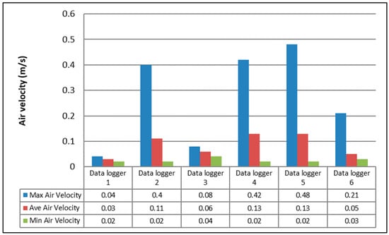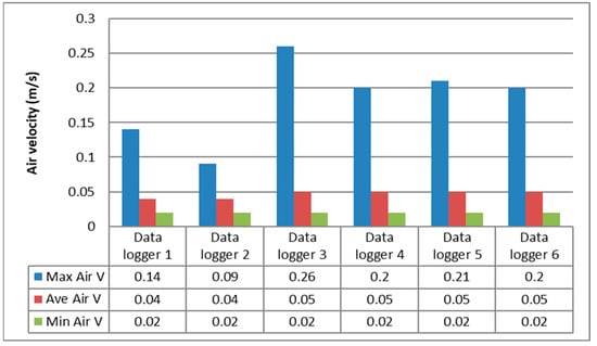As the library hall was equipped with a central air-conditioning system, the air velocity was almost constant for all the measured points. Figure 13 shows that the mean air velocity at 1.1 m above the ground (head level of a seated person) was only 0.05 ms−1, which was not tangible. The observed air velocity fell below the range of 0.15 ms−1 to 0.50 ms−1 recommended by MS 1525 []. The fluctuation of the air velocity was the lowest at pole 2, as it was between bookshelves. Thus, the air circulation was limited around the data logger at pole 2. According to the guidelines for air velocity in an indoor environment, the air ratio in the library hall was barely noticeable [].