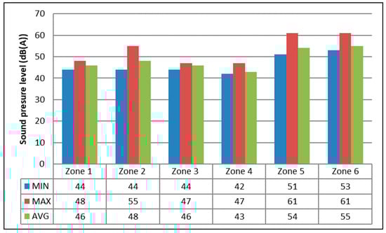 The data collected by the data loggers and sensors were initially analyzed using HOBO pro software and finalized for further analysis. In the next step, the data were categorized, and the outliers were removed. A further quantitative analysis of the data was carried out using Microsoft Excel to compare the results with the standards and guidelines. The average, minimum, and maximum values for the measured parameters were calculated, and they are presented in several graphs to make a comparison with the threshold limits for the IEQ parameters. The x-axis of the graphs presents the location of the measurement and the average, minimum, and maximum values of the parameters, and the y-axis of the graphs shows the measured parameter and threshold limit.