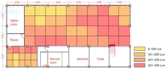 Studies on lighting retrofitting strategies are limited globally. In Italy, an ancient library in a historical building used a decomposition approach to control illuminance levels based on different occupant activities and visual tasks in various use areas []. Upgrading an artificial lighting system to an energy-efficient one is a less extensive retrofit that can be used when resources are limited or a single condition needs improvement []. For example, using LED technology and the smart grid concept in a library’s lighting retrofit resulted in a reduction in energy consumption of 54% (savings of 427 MWh/year) []. To achieve the highest energy efficiency in lighting projects, natural and artificial lighting must be combined, as they are influenced by the internal layout, facades, and solar direction. If natural light does not generate additional heat, resulting in an extra cooling demand, it can reduce energy use []. The factors that affect daylight levels include geographical location, sky conditions, solar orientation, exterior features, window frame size and arrangement, shutters, louvers, and interior surface reflectivity [].