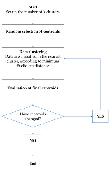 The final results were further assessed through the analysis of variance (ANOVA) tests [57] to decide whether the initial number k should be reduced. Figure 2 summarizes the iterative approach of k-means clustering.