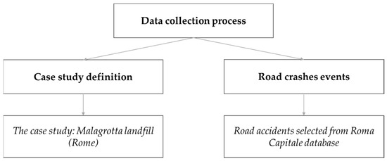 The study was developed starting from the analysis of Italian open access datasets. First, the case study (Malagrotta landfill) was selected from the database powered by the Italian Extraordinary Commissioner for the Remediation of Landfills. Second, road accidents that occurred in the Rome municipality were extracted from the database powered by Roma Capitale. Figure 3 summarizes the data collection process.
