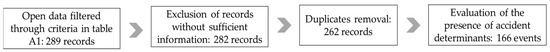 Screening of road accidents through the criteria reported in Table A1 allowed for identifying 289 tabular records. The exclusion of records without information on the conditions of road pavement, safety signs, traffic and visibility led to identifying 282 records. Then, duplicate removal allowed us to consider 262 events that occurred on the target infrastructures included in Table A1 in the period 2017–2021. Finally, the evaluation of the road accident determinants (through the matrix of descriptors) led to considering a reference sample of 166 events (in 96 event determinants were not associated with sufficient precision). In Figure 5, the data filtering scheme is reported.