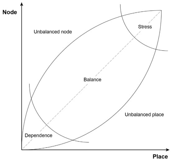 The node-place model was proposed for evaluating and classifying station areas, including TODs, based on their functions as both transport nodes and places for land use [23,24]. The model considers the balance between these two components and identifies areas that may require further development or improvement. Later, Bertolini (1999) [24] demonstrated how the node and place factors are interconnected and mutually beneficial, as exemplified by the case studies of the Amsterdam and Utrecht urban regions. In Figure 1, the x-axis shows the value of the place component, which generally reflects the level of activity or development intensity in the corresponding area. The y-axis represents the transport node value, which shows the quality of transport networks and systems, including the public transport systems.