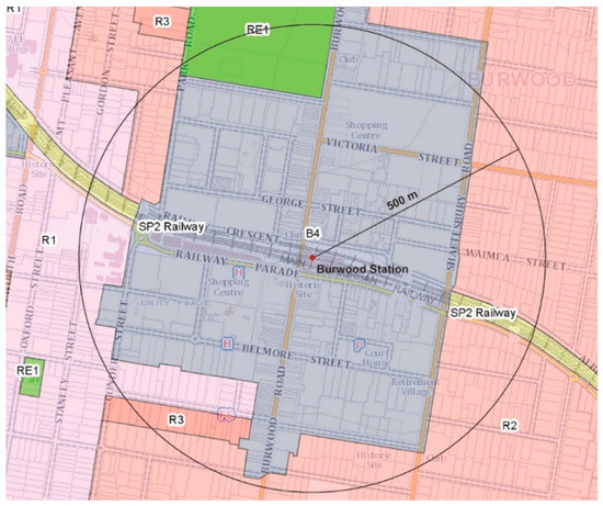 The predominant land use categories in the area surrounding Burwood Station are R1 General Residential, R2 Low Density Residential, R3 Medium Density Residential, RE1 Public Recreation, and B4 Mixed Use, as illustrated in Figure 3. The B4 Mixed Use Zone encompasses most of the lots within a 500 m radius of the station, and the land uses in this area are marked by a diverse range of residential, commercial, and retail activities. The area boasts a unique streetscape, characterised by a variety of building sizes and forms.