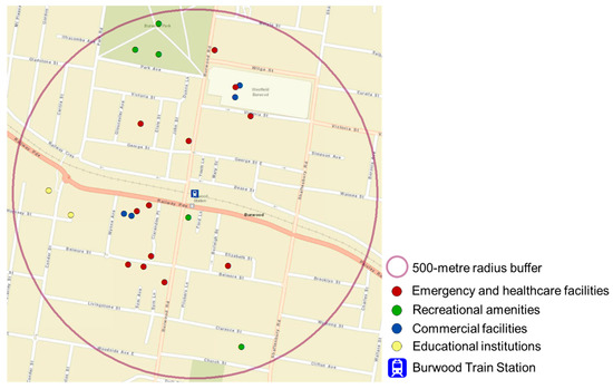 A place index consists of indicators mainly related to population, land use, and points of interest around transport hubs. These indicators are used to determine the demand for transport systems in the area surrounding public transit stations. According to the 2021 ABS census data, Burwood has a total population of 40,217 and a population density of 5651 people per square kilometre [37]. Burwood’s population has grown by 1861 individuals since 2016. Moreover, Burwood boasts a diverse occupational composition, with the highest number of individuals employed in education, health, and culture, constituting a population of 1243 [37]. Of the remaining occupational shares, 943 are employed in the retail, hotel, and catering sectors, the number of workers in the administration and services sectors is 634, and there are 371 people working in the industry and distribution sectors [37].