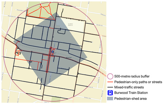 Within 500 m of Burwood Station, the total length of footpaths, defined as pedestrian-only paths or streets, or pedestrian paths separated from traffic, is 2744 m. The area that can be covered by walking distance within the prescribed five-minute walking time is 0.32 km2. Figure 5 shows a map of the pedestrian shed ratio and the pedestrian footpaths within the 500-m buffer catchment.