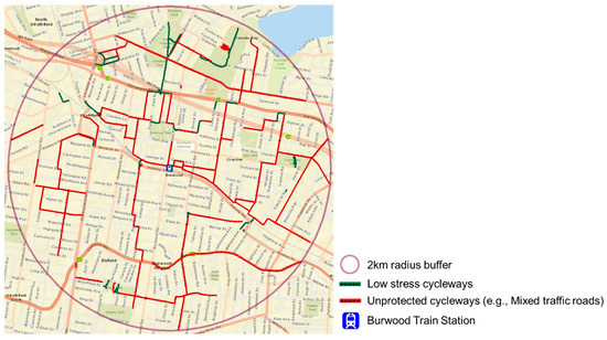 We calculated the total length of bicycle lanes within a 2 km boundary from Burwood Station by only taking into account LTS1 and LTS2 types of cycling paths (i.e., green-coloured links in Figure 6). This calculation was made with the assumption that cyclists could safely use these types of bicycle lanes to travel to the train station [39,40]. The calculated total length of bicycling lanes is 2703 m.