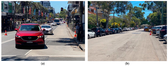 A multi-lane road (a) and a local street (b) where cyclists share the road with vehicles.