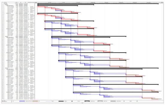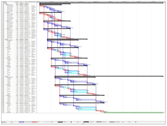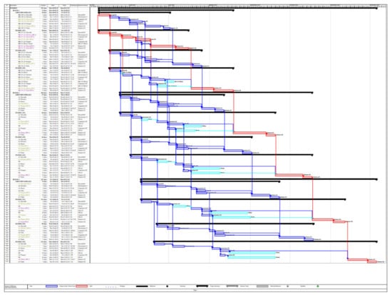 Figure 3, the critical path and critical tasks are highlighted in red while non-critical tasks are shown in blue. As the document is very extensive, we have included a detailed print screen in