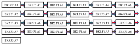 Figure 4, the ideal implementation of CCPM is depicted, where all tasks have durations reduced to half of their originally calculated values. This results in a total project duration of 98 days, with critical tasks shown in red and non-critical tasks in dark blue. The remaining 89 days are allocated at the end of the project as a Project Buffer (shown in green). The Feeder Buffer, represented in light blue, is allocated to the main activities to protect the critical chain from potential delays caused by non-critical tasks: BK1 (F1/A5, F3/A1, F3/A4, F3/A5); BK2 (F1/A2, F1/A4, F1/A5, F3/A2, F3/A4, F3/A5); BK3 (F1/A2, F1/A4, F1/A5, F3/A4, F3/A5).
