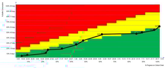 During the initial two months of the project execution, a portion of the buffer was utilized. Around 45% of the project duration remained within the green zone, with 22 days consumed from the buffer, indicating that no additional actions were necessary.