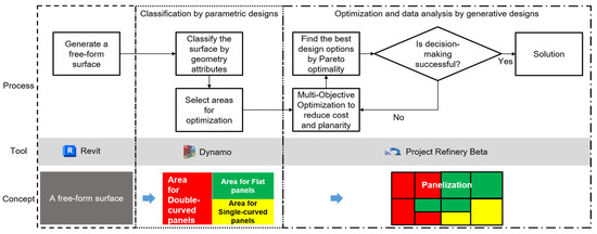 Figure 1 shows the overall research process. This study mainly focuses on classifying a free-form surface through parametric designs in the Dynamo-Revit interface and optimizing the designs through generative designs in Project Refinery developed by AutodeskTM by integrating with two optimization methods.