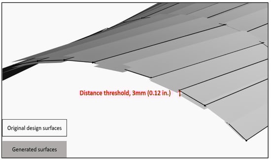 As mentioned previously, it is most important to take the requirements of design intent and construction cost into consideration for free-form surface modeling. Closeness and smoothness have been applied for design requirements in other studies [11,43,54,55,56]. However, the cost requirement was not adequately considered. Angle differences between panels are mostly used for smoothness. Eigensatz et al. [2] developed two algorithms to compare panels for surface smoothness as a parameter by applying a divergence threshold (a spatial gap between adjacent panels) of 6 mm (0.24 in.). For planarity or closeness, the distances between generated and original surfaces were measured, and the distance threshold was assigned as a form-finding method.