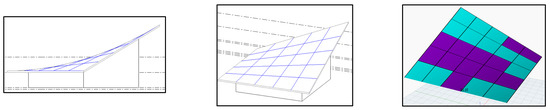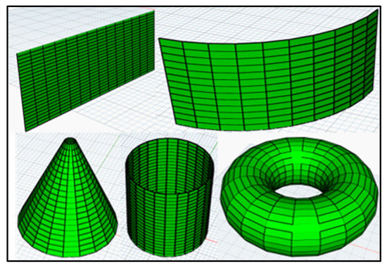For the validation of the suggested program flow, CPMGC, multiple case studies were performed. The algorithm in Table 1 was mathematically proven through several studies [46,58,59]. Due to the definition of single-curved surfaces, which can be unrolled into a plane without any stretching, tearing, or distortion because they have zero Gaussian curvature at every point [43], developable surfaces can be represented as flat surfaces (see Figure 7).
