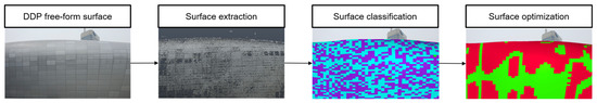 Figure 6 shows the result of classifying some of the free-form surface of Dongdaemun Design Plaza (DDP), divided by the UV grid of 37 × 49 panels. The surface was categorized into three areas: concave, convex feature areas favorable to DP, and flat surface favorable to FP. Thus, it is necessary to optimize the entire surface (except for the 2 FP areas).