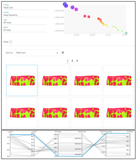 Figure 11 shows the entire process of the DDP case study. The surface in Figure 6 was optimized by using the proposed generative program flow, MOGD, and the results are shown in Figure 12. Inputs, the number of UV grids ranged from 20 to 40 (u grid) and 35 to 50 (v grid) to make each panel smaller than 1.92 m2, the size limitation, considering multiple factors [49]. The objective function was set to minimize Total Cost, Total Planarity, and DP Area. The selected surface has 1812 areas, and some of those areas (709 areas) have threshold distances within 3 mm (0.12 in.), so these areas are panelized by FP.