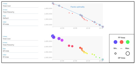 In order to choose the best design solution, Pareto optimality was applied along with two conflicting objective functions: Total Planarity and Total Cost. As shown in Figure 13, the blue line in the upper graph included seven points that formed the Pareto optimality or front. The big purple circle on the top-left side in the bottom graph is the closest design option to the original design (the bigger circle has a larger DP area). The small sky-blue circle on the bottom-right side in the bottom graph has the lowest total cost. The other pareto fronts represent other possible trade-offs. As shown in Table 2, design option No. 20 has the minimum total planarity with the maximum cost for the 1013.7 m2 (10,911.4 sqft) of DP and 226.2 m2 (2434.8 sqft) of FP. Compared to design option No. 1, which has the minimum total cost and the maximum total planarity, there are differences of 0.193 m (0.63 ft) in total planarity and USD 215,822 in total cost.
