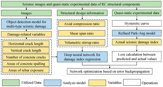 Note that a deep neural network is established for the damage index regression from the input variables of both damage-related parameters (sizes and numbers of various damage regions of concrete crack, concrete spalling, and rebar exposure) and structural design parameters (axial compression ratio, shear span ratio, and volumetric stirrup ratio). The damage-related parameters are automatically derived from images using a region-based object detection model for multi-type seismic damage by Xu et al. [36].