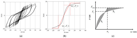 Based on the quasi-static experimental data of RC columns, the skeleton curve can be obtained from the hysteresis curve, as shown in Figure 2a,b. The yielding deformation and yielding force of the RC columns under cyclic loads are calculated as the average value in positive and negative cycles, as follows