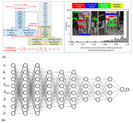 Schematic for autonomous regression of the seismic damage index using seismic images and quasi-static experimental data. (a) Region-based object detection model for multi-type seismic damage (Xu et al. [36]). (b) Deep neural network for seismic damage index regression.