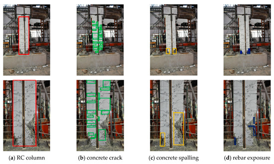 The investigated dataset contained the quasi-static experimental data and the corresponding seismic images for a total of 124 RC columns from PEER [60] and previous studies [36,61]. Multi-type seismic damage, including concrete cracks, concrete spalling, and rebar exposure, was recorded during the entire process of quasi-static experiments in multiple scenes, scales, and resolutions. Data from RC columns No. 1~No. 100 were used for training, and the rest of RC columns No. 101~No. 124 were used for validation. Figure 4 shows several representative seismic images and bounding box annotations of RC columns with multi-type seismic damage. This indicates that the severity distributions and geometrical features of the investigated seismic damage were quite different and that complex backgrounds of structural edges and other disturbances were included.