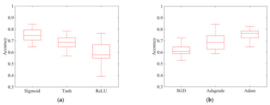 Figure 5 shows the optimization schematic of the network structures and training hyperparameters through grid search. After the grid search optimization was performed, the following network structure and training hyperparameters were selected, including a hidden layer number of 10, a neuron number of 10 in each hidden layer, a learning rate of 0.25, and a regularization coefficient of 0.016. Figure 6 shows comparisons of model accuracy on validation data using different activation functions and optimization algorithms. The results show that using the sigmoid activation function and Adam optimization algorithm obtained the highest average accuracy and lowest deviancy.