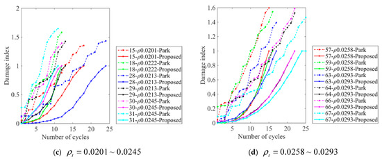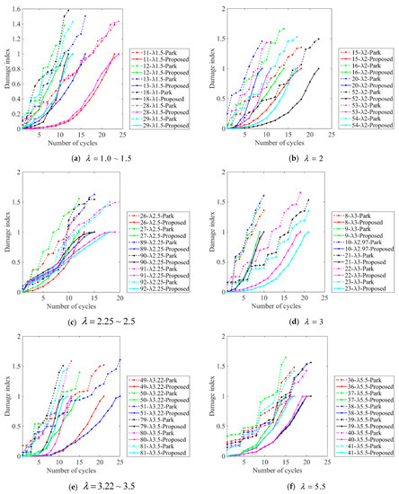 To demonstrate the effectiveness and necessity of the refined Park-Ang model to calculate the seismic damage index from experimental data, this section conducts comparative studies between the refined and original Park-Ang models for different RC columns with various shear span ratios, concrete strengths, and reinforcement ratios, as shown in Figure 7, Figure 8 and Figure 9, respectively. For a more straightforward illustration, the columns are divided into various groups within specific ranges of shear span ratios, concrete strengths, and reinforcement ratios as subfigures. The legend is arranged in a unified manner in the following order: specimen number—parameter type—parameter value—model name.