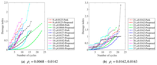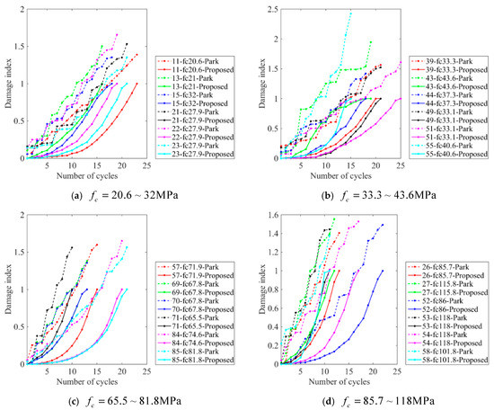 Figure 8 shows the comparative results of the calculated seismic damage index using the refined and original Park-Ang models with different concrete strengths ranging from 20.6 MPa to 118 MPa. Similar phenomena could be observed, including the following: (1) the original Park-Ang model only showed a linear accumulation process of seismic damage with an equal developing speed, and (2) the damage evolution speed of the refined Park-Ang model in the later stage significantly increased showing a trend of exponential growth. The results indicate that the refined Park-Ang model could accurately reflect the nonlinear accumulation of seismic damage (e.g., nos. 11, 51, 85, and 52) and that the performance exceeded the original model for different RC columns with low and high concrete strengths.