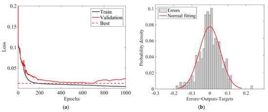 Training and validation loss and prediction error. (a) Training and validation loss curves and selection of the optimal model. (b) Statistical distribution of the prediction error of the seismic damage index.