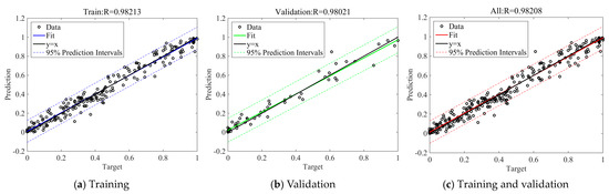 To predict the seismic damage index from an image of the RC column, the damage-related parameters were extracted in Section 2.3 and used as inputs together with the design-related parameters in order to accomplish the feed-forward process of the well-trained deep neural network (as shown in Figure 3b). Figure 11 shows the corresponding model performances for seismic damage index regression on the training and validation sets. The results indicate that the correlation coefficients between the predicted and actual values of the seismic damage index exceeded 0.98 for both the training and validation sets, suggesting that the model was stable for different samples in the training and validation sets. The validation accuracy was only slightly lower than the training accuracy (the correlation coefficient decreases by 0.2%), indicating that the trained model was not overfitted. Figure 11 shows that 94.3% of predictions fell inside the regression interval with a 95% confidence. The predicted seismic damage index was scattered and uniformly distributed on both sides of the central line, indicating that the proposed method was approximately unbiased with high fitting goodness. Figure 10b also shows the statistical distribution of the prediction error for the seismic damage index. It indicates that the prediction error approximately obeyed a normal distribution, and the mean value was located near zero. The statistical results suggest that the established deep neural network had a good prediction ability for seismic damage index and was stable for different RC columns.