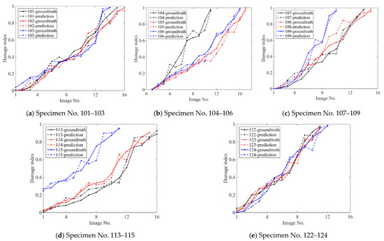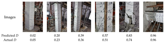 It should be noted that this study established an autonomous regression method for the seismic damage index of RC columns with groups of design parameters. Therefore, it is necessary to further demonstrate the robustness and generalization ability of the proposed method for RC columns with new design parameters for real-world applications. Table 1 shows the size and design parameters for 11 new RC columns, which were different from the investigated dataset in Section 3.1. The validation dataset in this section was collected from a previous study [61] and from Datacenterhub [62]. A total of 199 images were taken during the quasi-static tests of RC columns. It should be pointed out that the collected images were not continuously taken in the quasi-static test process, and the actual value of the seismic damage indicator for these collected images could not be accurately obtained. Figure 14 shows some representative groups of onsite quasi-static experimental images and the corresponding predicted seismic damage indexes for four different RC columns. The results indicate that the proposed method could reasonably predict the seismic damage index of RC columns with different design parameters under various real-world scenarios from images of quasi-static experiments.