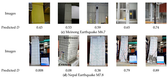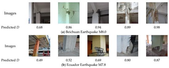 Figure 15 shows the representative prediction results of the seismic damage index for RC columns using onsite inspection images after four earthquakes. The results show that the proposed method can basically predict the seismic damage severity of RC columns from actual post-earthquake images in various real-world scenarios.