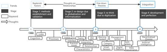 In the 1960s, only a few performance evaluation methods were available, and the utilized indexes were quite few []. From the 1970s to 1980s, the study of performance evaluation methods went deeper and wider to develop core indexes, especially for the performance evaluation system formed by the financial industry [,]. In the 1990s, scholars began to try to address the shortcomings of the independence, subjectivity, and enforceability of performance evaluation methods. This stage was the reflective revaluation phase of performance evaluation []. In the following fifteen years, scholars supplemented the previous studies while improving on information processing with computer techniques, developed as shown below in Figure 1. The performance evaluation method began to integrate with computer science developments such as smart sensor systems, digital platform application, data science, and artificial intelligence [,,]. Figure 1 shows a brief timeline of the progress of performance evaluation methods since the 1980s.