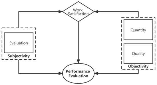 On one hand, the review from 1980 to 2020 provided results for evaluation indexes after filtering with keywords such as intelligence, smart, performance evaluation, and smart construction supervision. After the expert interview and questionnaire, the evaluation indexes could be determined as a basic conclusion. As a result, the influence path was sketched, as in Figure 3 below, to clarify the workability. Firstly, the index dimension was divided by two aspects: objectivity and subjectivity. The objectivity aspect contained two evaluation sub-items, namely, work quantity and work quality. Similarly, the subjectivity indicated evaluation by other significant factors. These divided dimensions both had responsibilities regarding work satisfaction and eventual performance evaluation. Furthermore, the work satisfaction was related to performance evaluation as well; the proposed method proved that there are features of relevance and synergy.