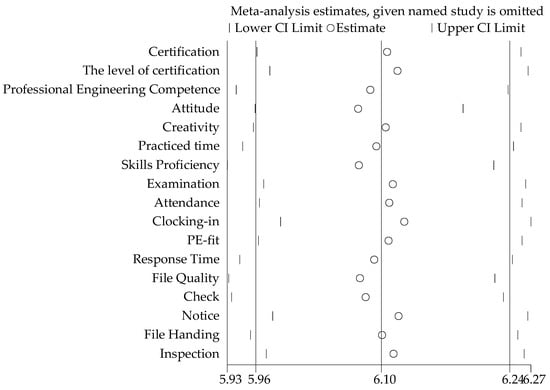 While Cronbach’s alpha refers to the operation of reliability analysis, sensitivity analysis refers to the stability of the result. Figure 5, below, can be seen as the sensitivity analysis of the evaluation indexes. In general, the confidence interval is an estimation interval which is structured by the population parameter based on the sample statistics. The lines located at the values of 5.96 and 6.24 demonstrate the 95% confidence interval of the effect size. The middle line, at the value of 6.10, is the combined effect size. The small circle is the effect size if the item is deleted. If there is an outlier which drops out of the confidence interval, it means that the item has a strong influence on the analysis as an unstable factor. In summary, the effect size of the evaluation indexes in this study was located in the confidence interval. The evaluation indexes showed a stable performance using the model, and they were able to be used for the following computation.