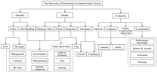 Quantification replaces the subjective method of evaluation with mathematical modeling []. The quantitative performance is intuitively reflective of the results. Therefore, the evaluation plan must be responsible for the outcome of the evaluation. Meanwhile, the evaluation indexes must be correct and feasible. By quantification of the indexes, construction supervisors are able to respond and track all critical activities and information by logging and recording throughout the life of an engineering project. For the determination of the evaluation indexes, the preliminary conclusions were summarized based on expert interviews and questionnaires. For weighting, a growing number of enterprises, institutions, and other relevant parties have adopted modern evaluation methods to make performance evaluation more scientific, humane, safe, and fair [,,].