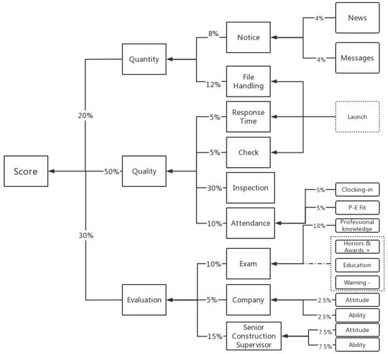 The schematic diagram is used to display the factors of the performance evaluation and the evaluation information, such as the scoring standard, evaluation grade, and comments []. Meanwhile, it is easier to determine the factors in line with the performance status of construction when analyzing the evaluation scores.