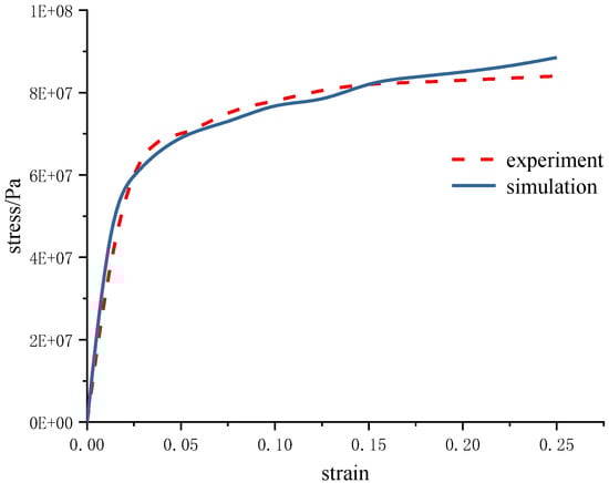 Two methods of software simulation and experimental testing are used to verify the correctness of the theory. The first group of experiments used Q235 ordinary carbon structural steel tensile test, and the mechanical properties of the experimental materials are shown in Table 1. The same parameters were used for the experiment and simulation, that is, the shear rate was constant 5 mm/min with and without ultrasonic energy. The high-energy ultrasonic power is 250 W, and the frequency is 20 KHz. The first set of experimental results, shown in Figure 1, was performed using the uniaxial tensile experimental data of Daud et al. The simulation results are in good agreement with the experimental results.