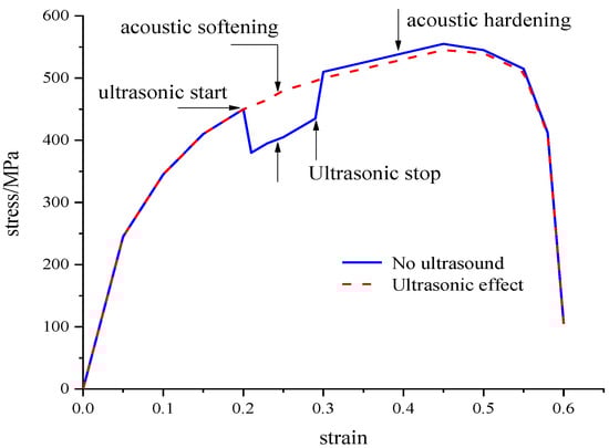 The second set of experiments used Q345 steel, and the mechanical properties of the material are shown in Table 1. The same high-energy ultrasonic excitation was used as in Experiment 1, except that the high-energy ultrasonic generator was turned on and then turned off. The experimental results are shown in Figure 2, using the experimental data of Siddiq et al. The experimental results show the following: when the ultrasonic generator is turned on, the stress required to generate the same strain decreases immediately, which is due to the ultrasonic softening effect; when the ultrasonic generator is turned off, the tensile stress rebounds to a higher value than the average value. This phenomenon is akin to work hardening and is independent of the frequency of the high-energy ultrasonic waves; rather, it is correlated with the intensity of the waves.